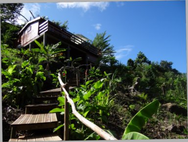 Une fois stationné, l'accès au bungalow se fait par un escalier bordé de fleurs tropicales et d'arbres fruitiers. |